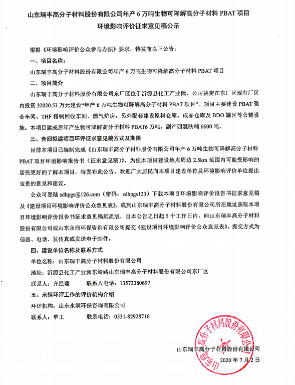 好博在线官网年产6万吨生物可降解高分子材料PBAT项目环境影响评价征求意见稿公示